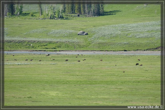 Unter anderem im weniger stark frequentierten Lamar Valley im Nordosten des Parks gibt es Bisonherden, die gerne auch mal auf der Strasse spazieren. Bisonbullen findet man aber ueberall im Park, ausser in der Paarungszeit sind sie meistens alleine anzutreffen.