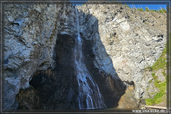 Rustic Falls: Auf dem gleichen Streckenabschnitt weiter noerdlich, etwa 4,5 Meilen von Mammoth Hot Springs entfernt, befinden sich die Rustic Falls direkt neben der Strasse. An dieser Stelle stuerzt das Wasser des Glen Creek etwa 14 Meter in die Tiefe.