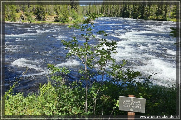 Confluence Bechler and Fall Rivers: Laeuft man von den Cave Falls den Trailhead in Richtung Bechler Falls, erreicht man bereits nach kurzer Zeit den Zusammenfluss des Bechler und des Fall Rivers. Damit befindet sich der Bechler River, der an dieser Stelle endet, vollstaendig innerhalb der Parkgrenzen. Sowohl seine Quelle, als auch die 28 Kilometer entfernte Muendung in den Fall River, liegen innerhalb der Grenzen des Yellowstone National Parks. |