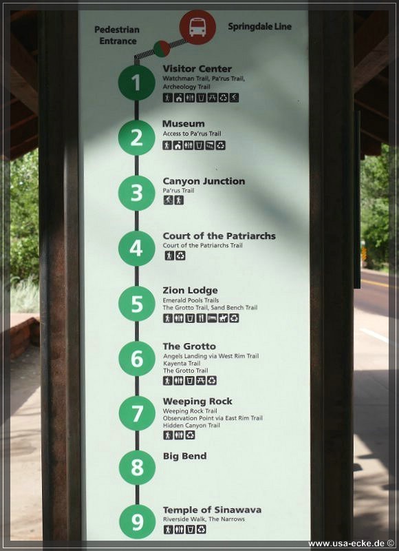 Insgesamt neun Haltestellen werden angefahren, und die wollen wir jetzt kurz vorstellen. Die Trails im Valley sehen wir uns dann unter dem Punkt Zion Valley etwas genauer an, zwei der drei Trails, die am Visitor Center beginnen, wollen wir aber hier gleich erwaehnen.